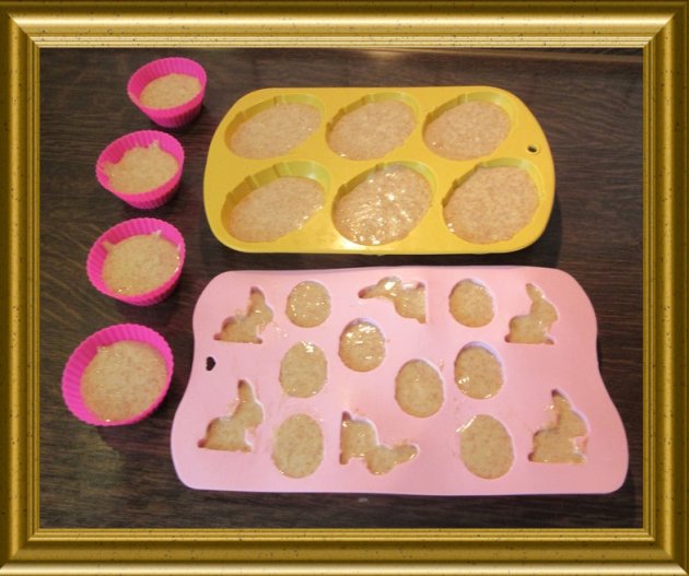 Es bietet sich auch ein entsprechendes Muffinblech an. Auch kann man Silikonbackformen mit Ostermotiven verwenden. Der Teig wird entsprechend der Form verteilt. Achtung! Evt. veränderte / verkürzte Backzeiten berücksichtigen ! |