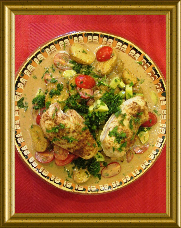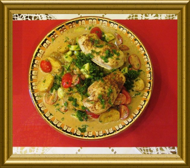 | 1 EL Rapsöl | rundherum ca. 5 Min. goldbraun anbraten. Danach die Hähnchenfilets auf das Backblech zu den Kartoffeln legen und 10 Min. mit backen. | |
