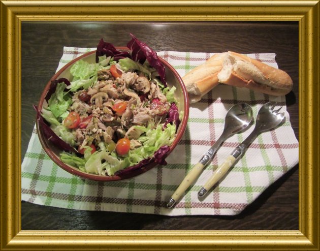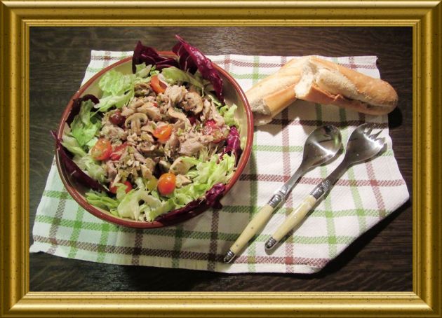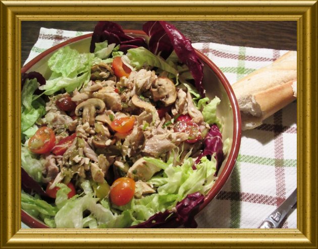| einigen Salatblättern (Kopf-, Radicchio- oder Eisbergsalat) | auskleiden und den gut durchgemischten Salat locker in die Mitte setzen. | |