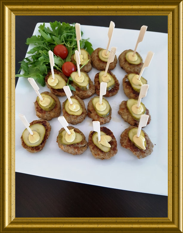 Nach Belieben Spreewälder Gurken in Scheiben geschnitten sowie Senf nach Geschmack auf die Bouletten garnieren. Die Bouletten mit Holzspiesschen versehen. |