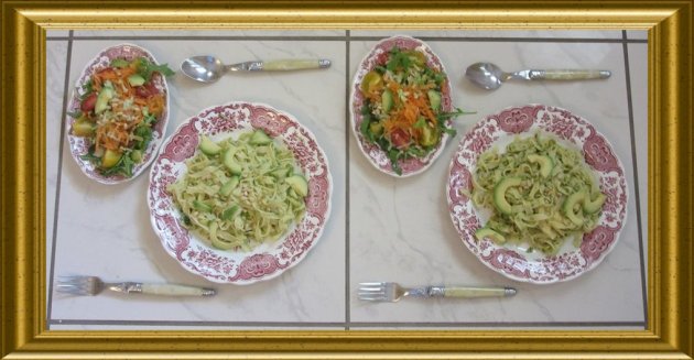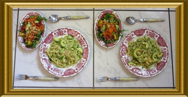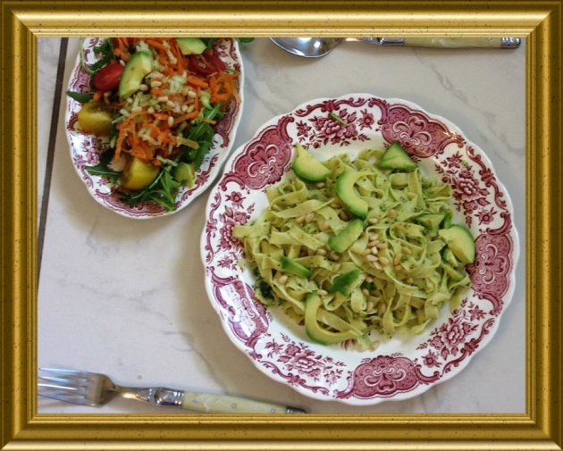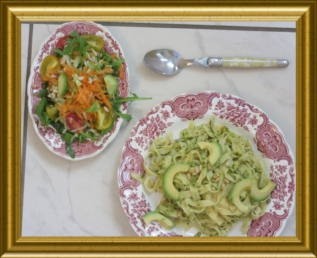 Pasta mit Broccolipesto zu Avocado-Rucola-Salat |