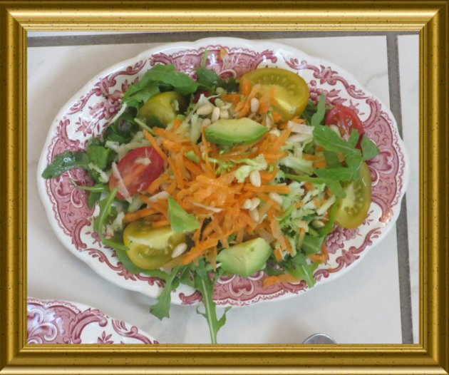 | Das Dressing über die Salatzutaten sowie | ||