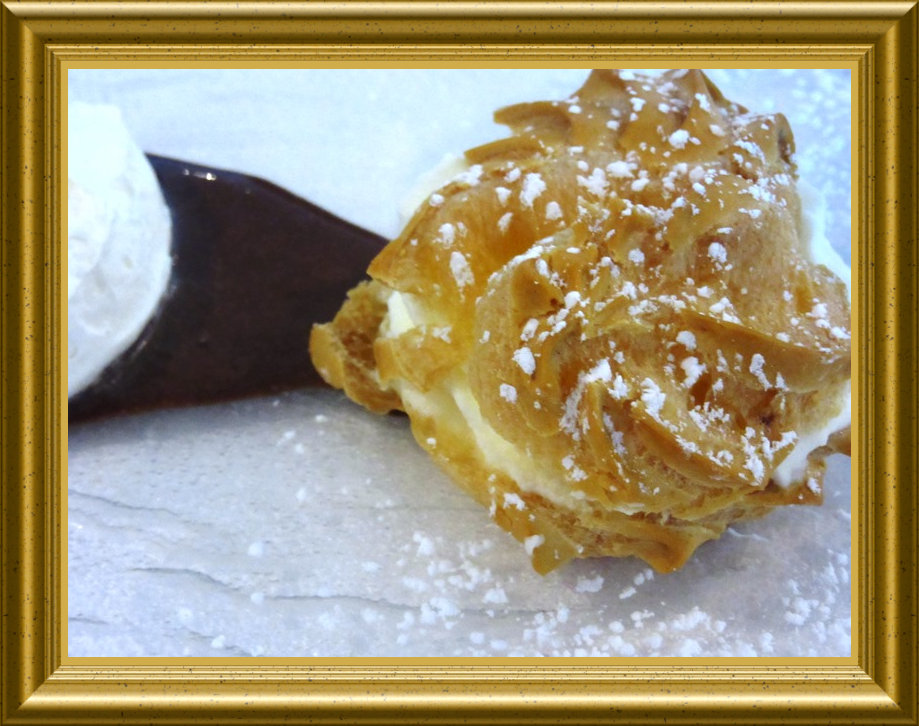 | Ein Profiterole, Windbeutel oder Chou à la Crème ist eine gefüllte französische Brandteigkugel mit einer süssen Füllung.