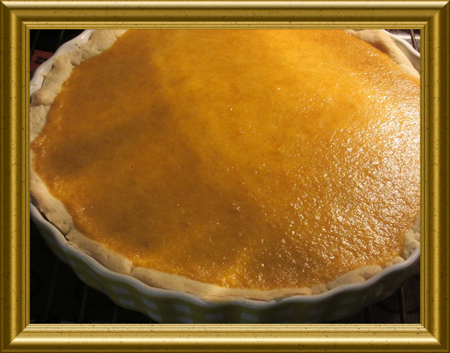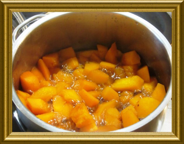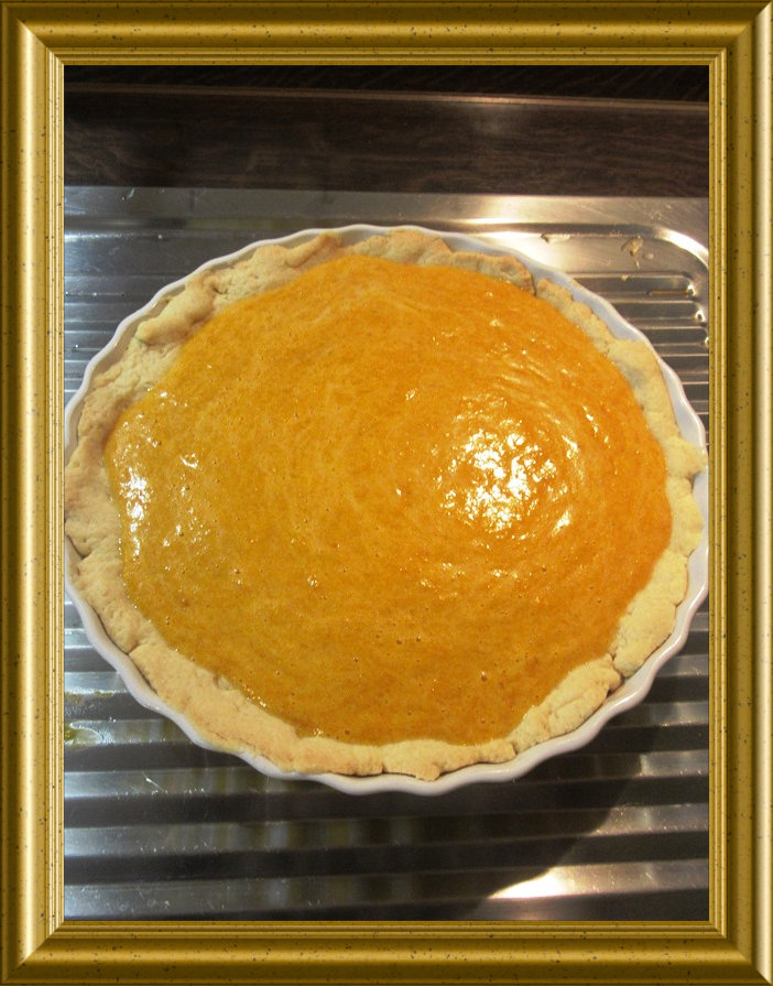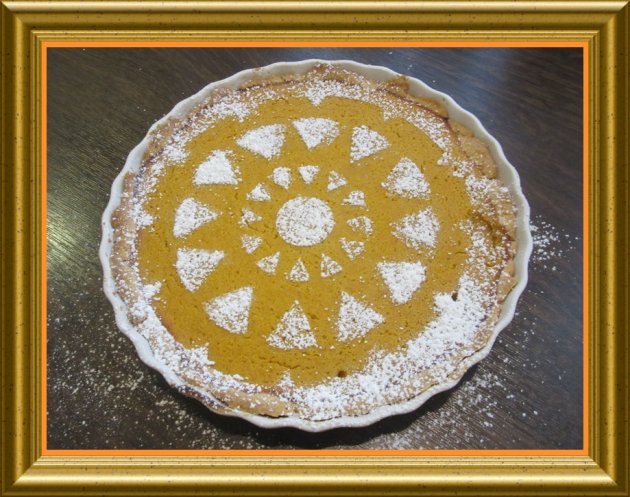 | Auf den vorgebackenen Boden nun die Kürbisfüllung verteilen. | ||