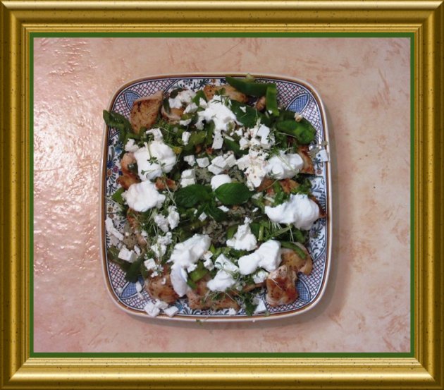 Alles auf einer grossen Servierplatte anrichten und nun die in Streifen geschnittenen Hähnchenfilets sowie die gerösteten Paprikastreifen darüber verteilen. Mit |