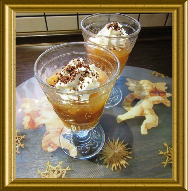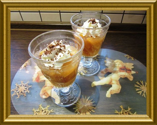 | Das Kompott mit Schlagsahne und Schoko-Amarant garniert servieren. | ||