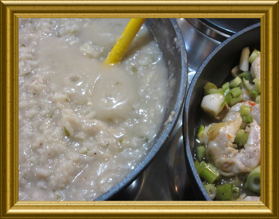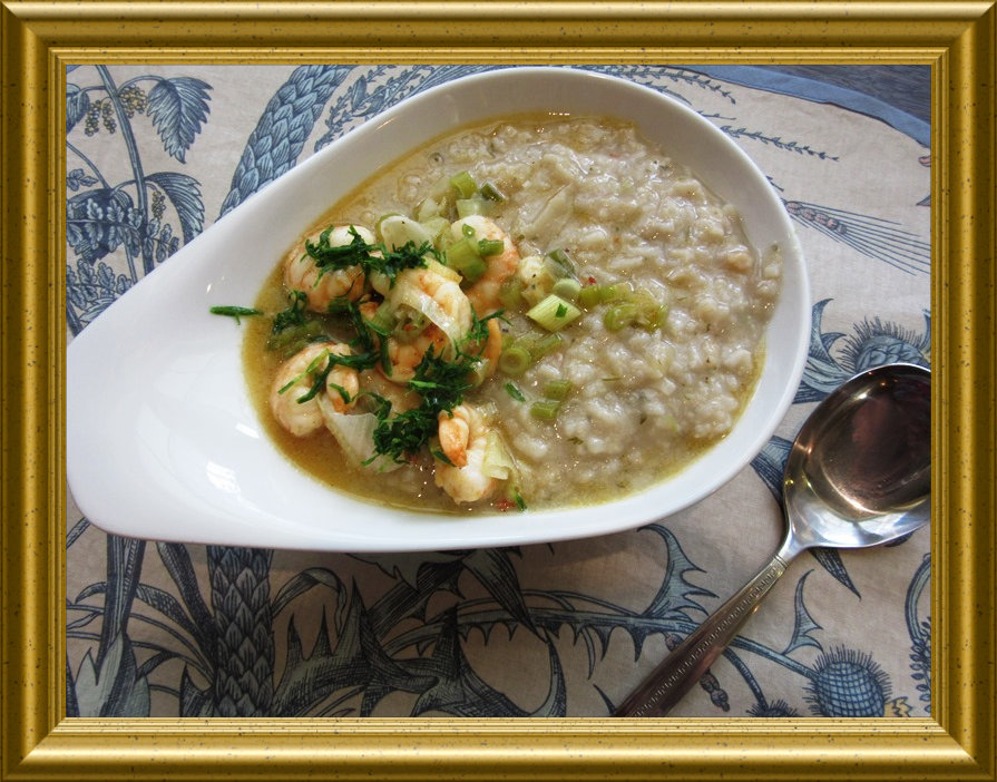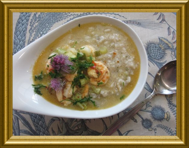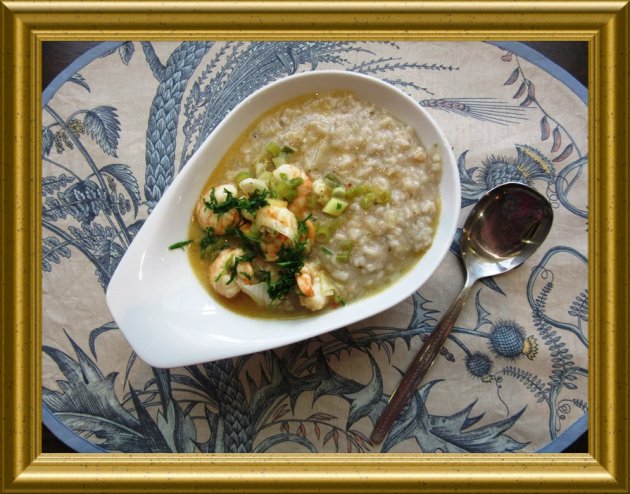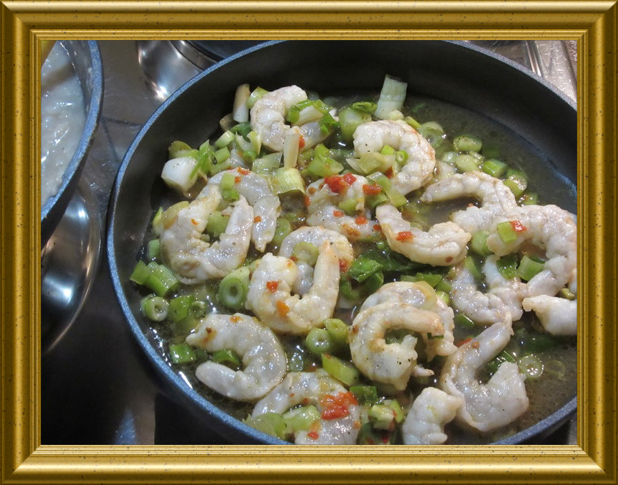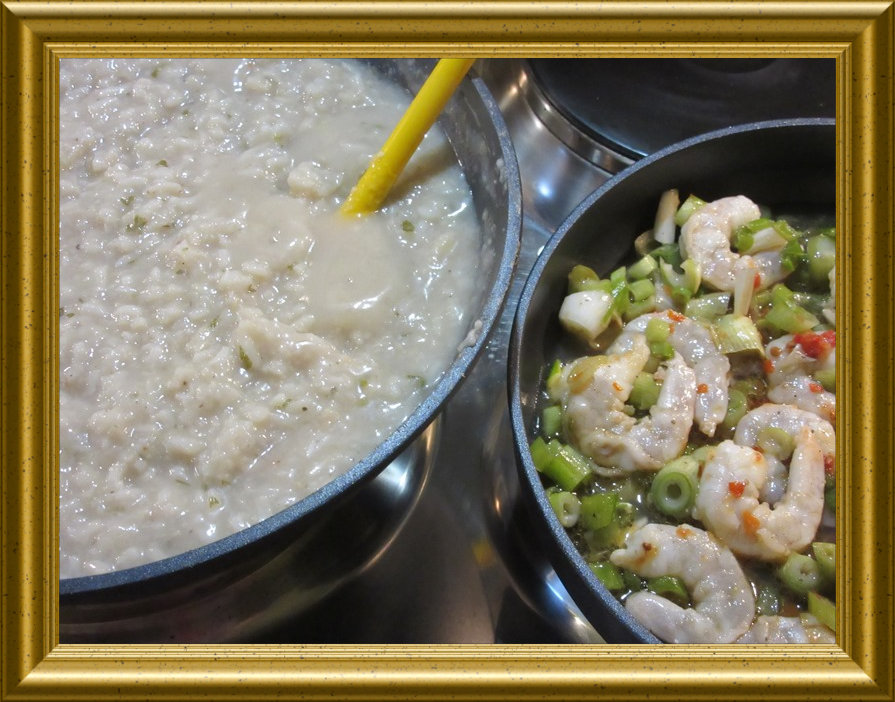 | Erst kurz vor dem Servieren werden die Garnelen angebraten und auf dem Reisbrei angerichtet. | ||