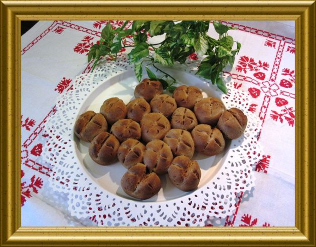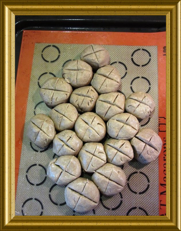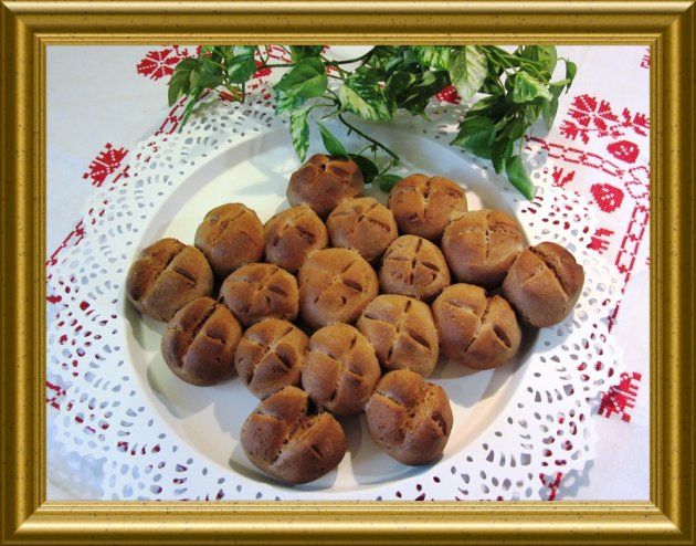 | Die Brötchen auf ein mit Backpapier ausgelegtes Backblech aneinander leicht setzen und kreuzweise einschneiden (oder einen Brötchenausstecher benutzen). | ||