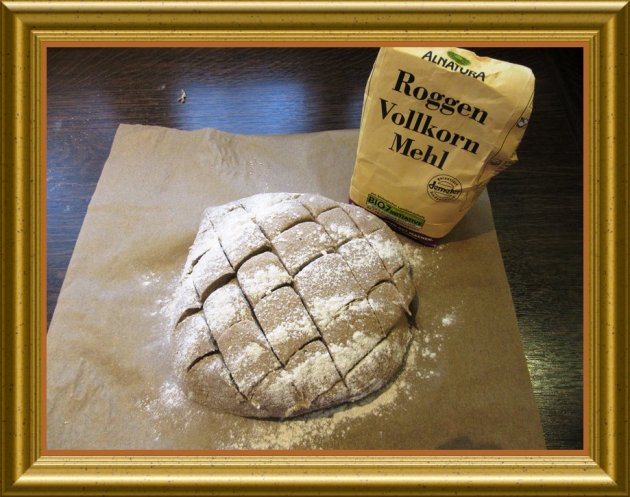 | Das gut aufgegangene Brot leicht einschneiden und mit Mehl besträuben. | ||