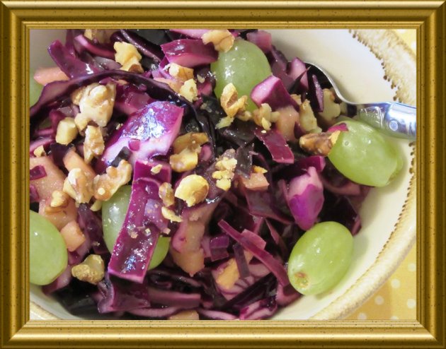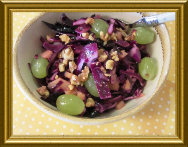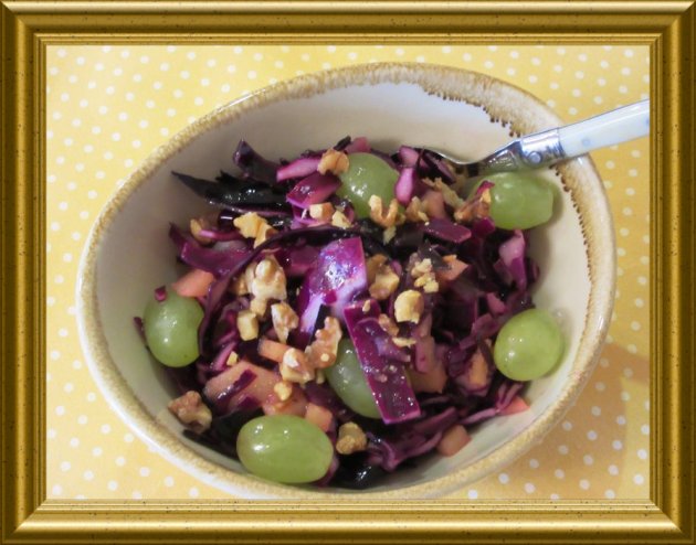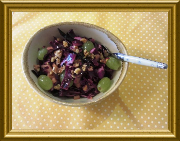 | 250 g kernlose Trauben | unter den Rotkohl und die abgekühlten Quittenstücke geben.