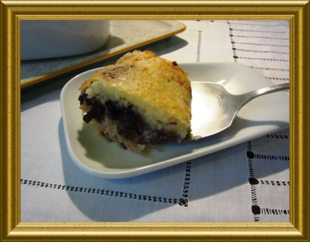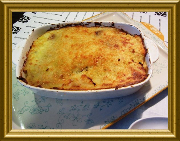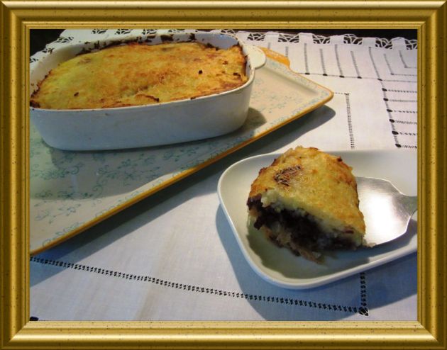 | Eine grosse Auflaufform leicht fetten und das Sauerkarut einschichten. Die Wurstscheiben darauf verteilen und den Kartoffelsatmpf oben auf setzen. Gleichmässig den Stampf verteilen. | ||