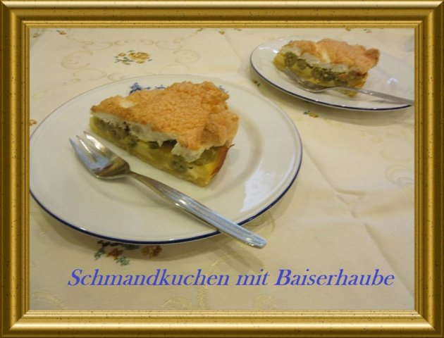 | 100 g Zucker | einrieseln lassen. Den Schmandkuchen nun nach dem Backen mit dieser Baisermasse verzieren. Den Baiser aber gleichmässig hoch verteilen. | |