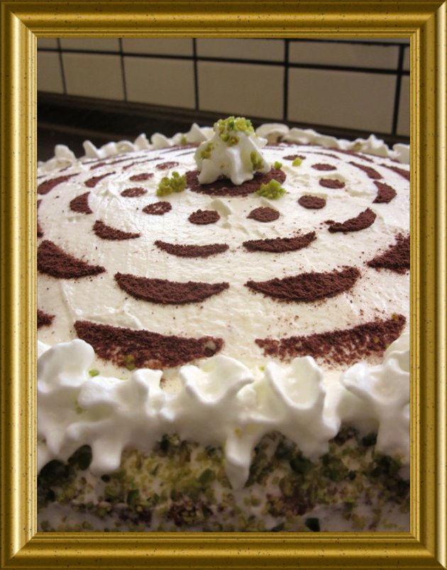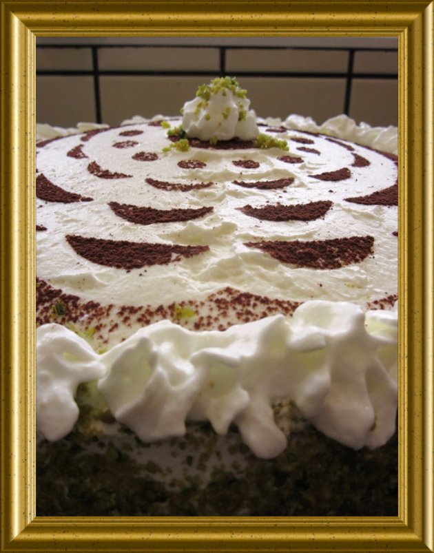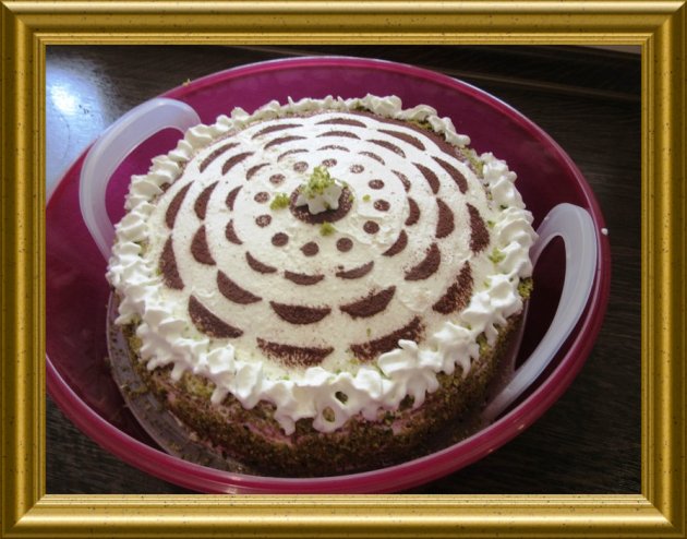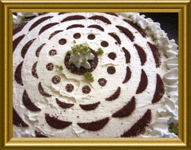 | Den Rand der Torte nun mit Sahnetupfer mit der Créme im Spritzbeutel verzieren. | ||