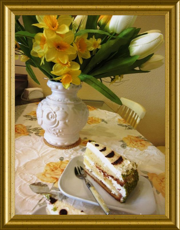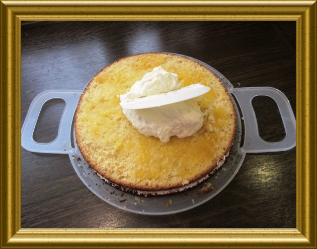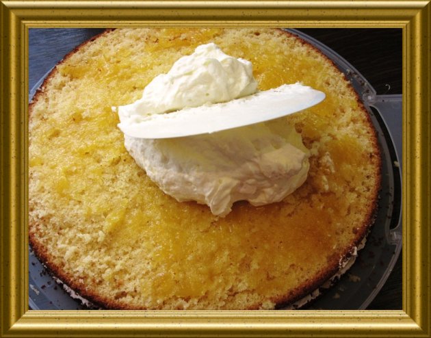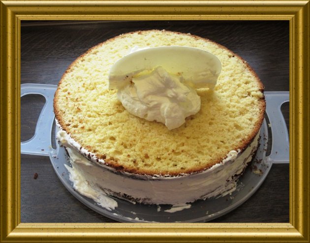 | Nun die beiden unteren Böden dünn mit der Sahne-Quark-Créme bestreichen und die Torte entsprechend der Reihenfolge wieder zusammensetzen.