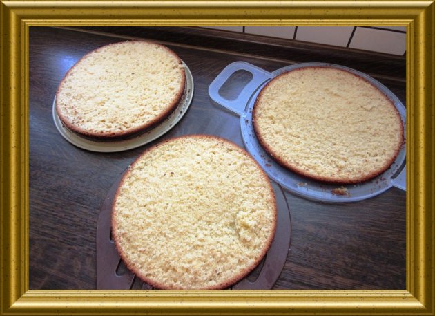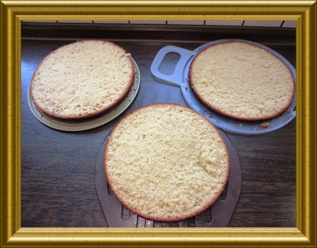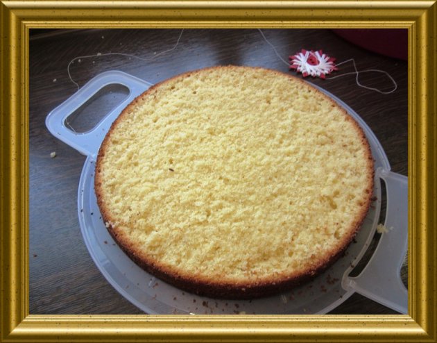 Anschliessend mit Hilfe eines Zwirnfadens den Kuchen aufschneiden. Man benötigt insg. drei Böden.