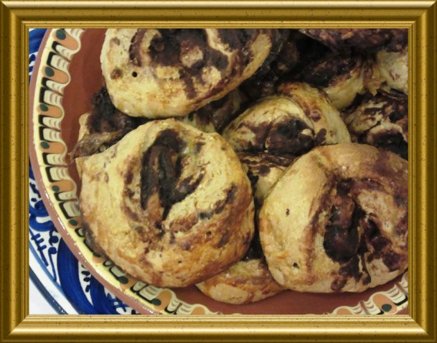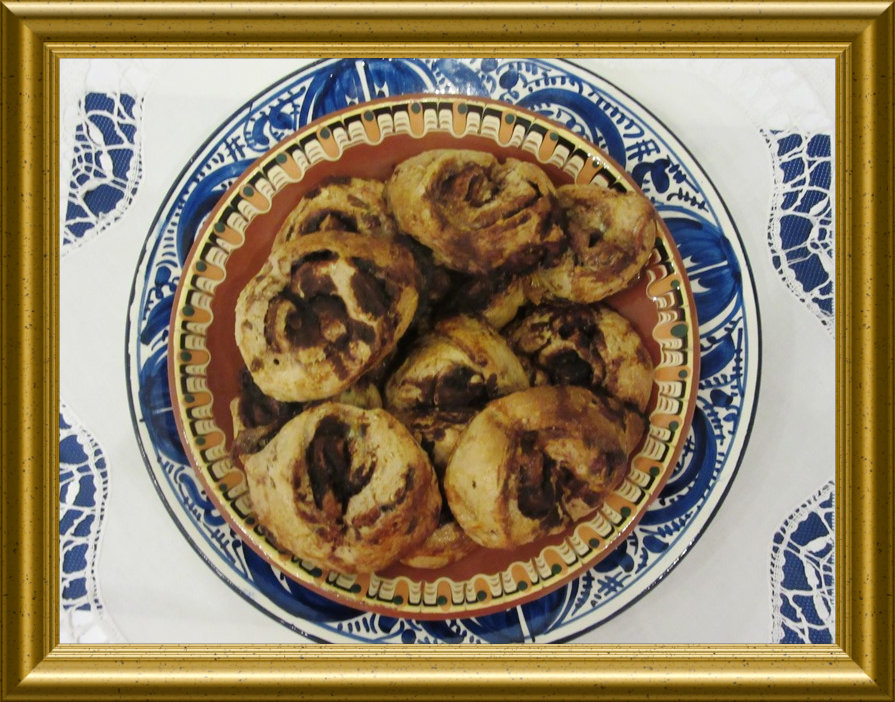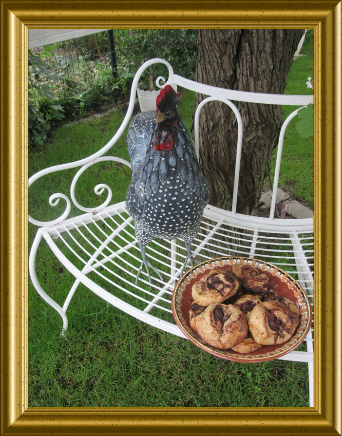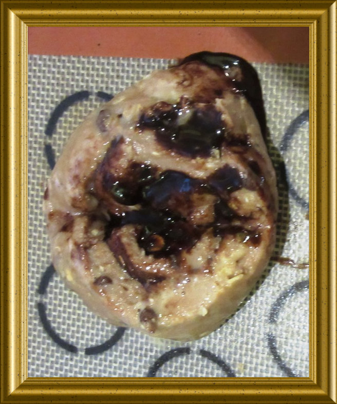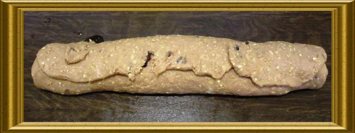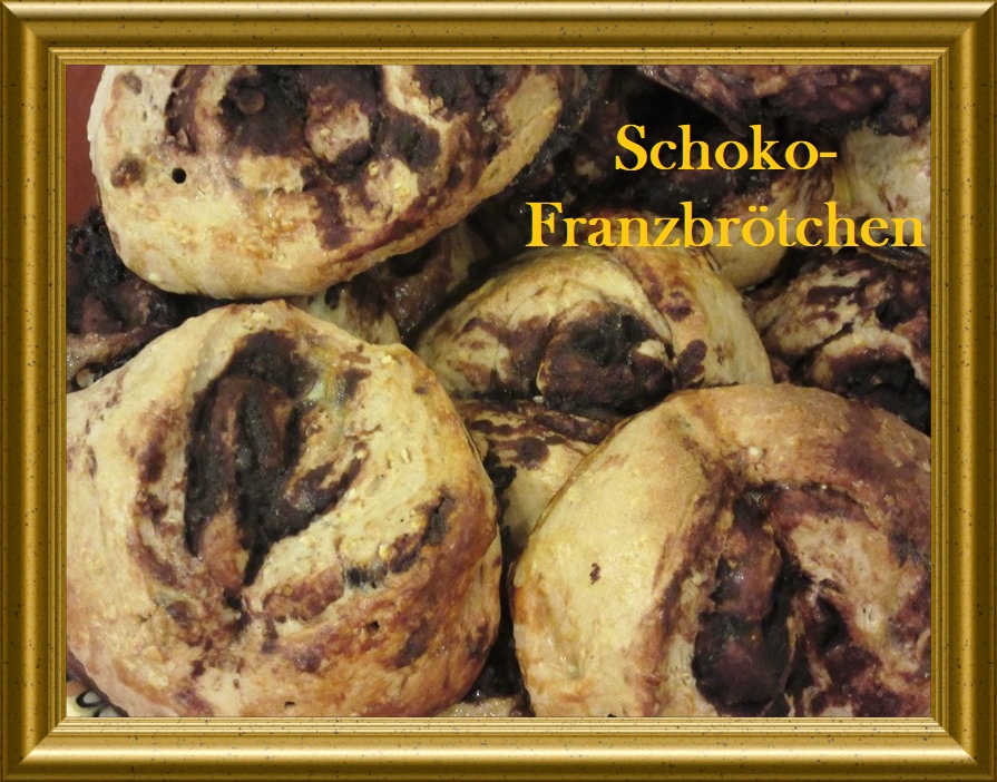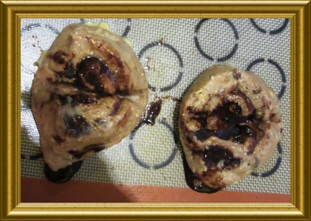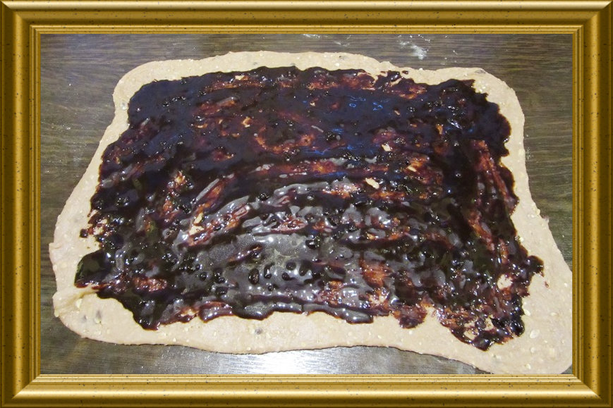 Statt auf einer Mehlschicht auszurollen benutze ich hier wieder eine Backmatte. Die Füllung auf den Teig streichen und von der Längsseite den Teig aufrollen. Danach in ca. 4 cm breite Scheiben schneiden und diese auf ein mit Backpapier (bzw. mit einer Backmatte) ausgelegtes Backblech legen. Mit Hilfe eines Holzlöffelstieles jede Scheibe mittig und parallel zu den Schnittkanten eine tiefe Kerbe bis zum Boden eindrücken, sodass die typische Form der Franzbrötchen entsteht. Anschliessend das mit |