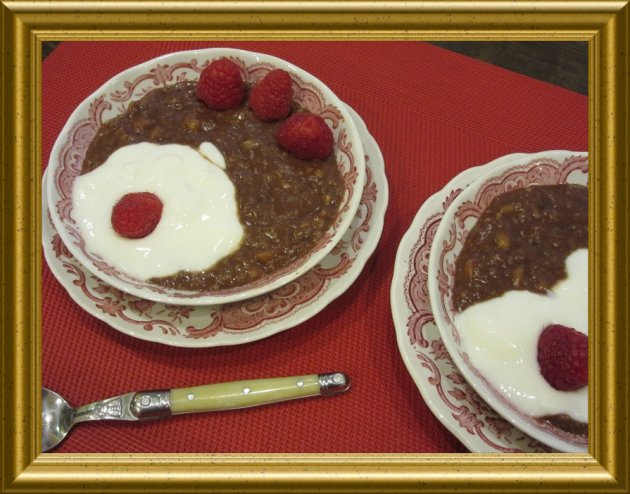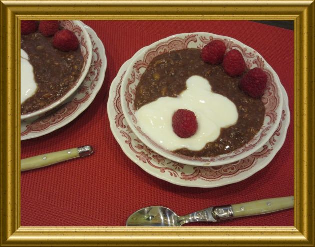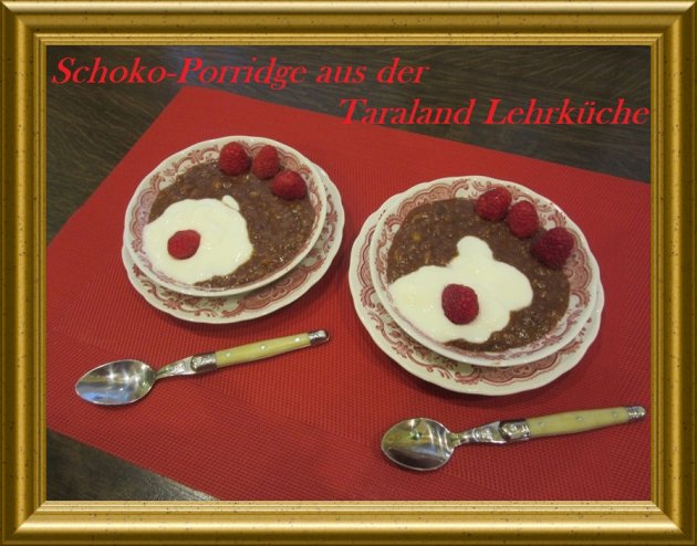 Schoko- Porridge mit Bananenscheiben und mit etwas Zimt bestreut zu griechischem Joghurt sind ein Genuss. Trockenfrüchte wie Rosinen oder getr. Aprikosen in der Grundmischung sind eine weiter Variation. |