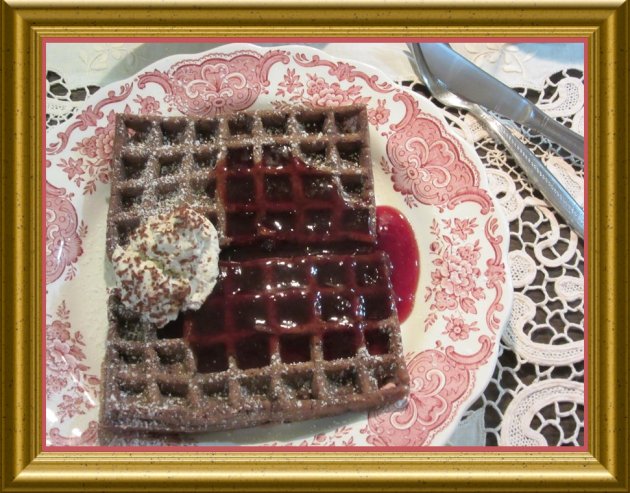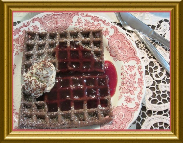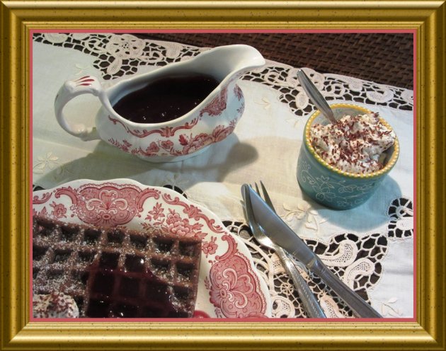 | Die Schokowaffeln werden warm oder kalt zu der Rotweinsauce mit Cottage Cream on top serviert.
