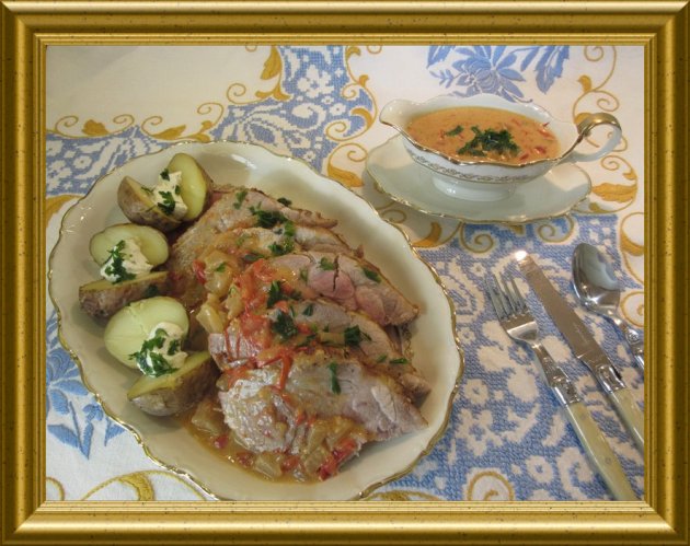 Hierzu empfehle ich Backkartoffeln aus der Alufolie, die je nach Grösse neben den Bratenschlauch mitgegart werden können. |