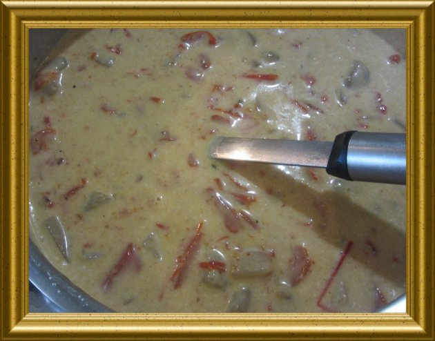 | 1 Gl. marinierte Paprikastreifen | mit dem Sud aus dem Glas und | |