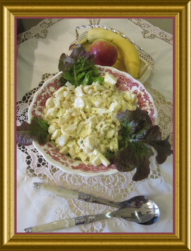 geschält, in dünne Scheiben geschnitten zum Salatdressing geben. |