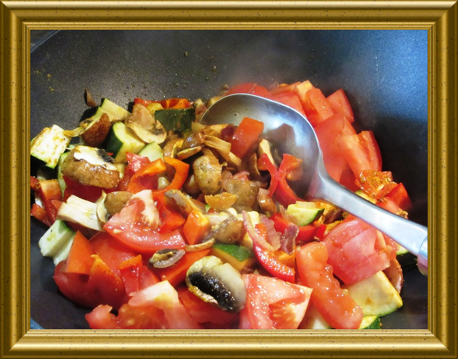 | 2 mittelgrosse Tomaten | in Würfel geschnitten hinzufügen und mit andünsten.