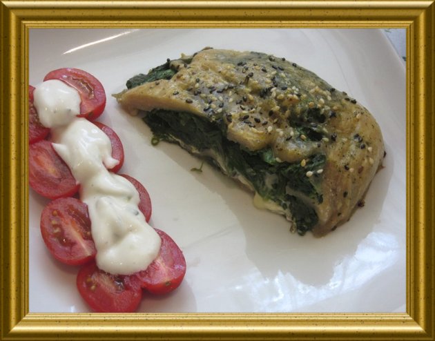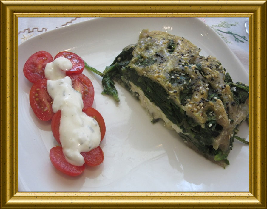 | 200 g Fetakäse (od. Bulgarischen Weichkäse) | mit den Fingern über den Spinat zerbröseln.