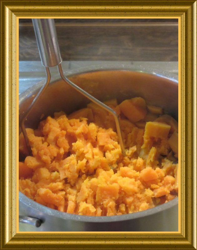 Ca. 15 Min. benötigen die geschälten, in kleine Stücke geschnittenen Süsskartoffeln.