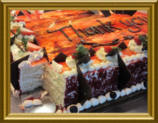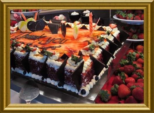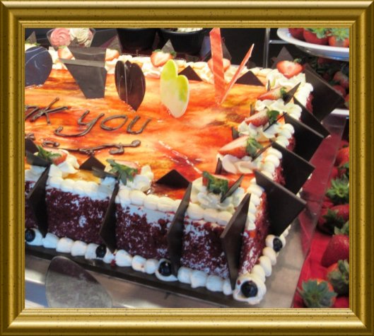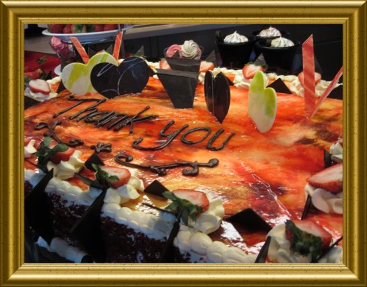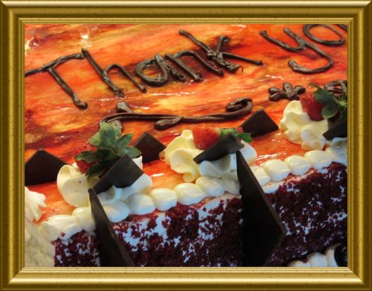 PS. Die Torte ist aus vier ganzen Blechen hellem Rührteig hergestellt. Die Böden sind mit Käse-Sahne-Créme zusammengesetzt und rundum bestrichen. Zartbitter-Schokoraspeln am Rand und eine leichte Erdbeergeleefruchtmasse on Top. Zartbitter-Schokotäfelchen und viele viele frische Erdbeeren und gefühlte „50.000“ (diese stehen für Euch alle) Sahnetupfer schmücken diese Torte. Am Sahnetupferrand sind noch einige Blaubeeren. Mit Schokoglasur, sage ich „THANK YOU“!