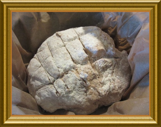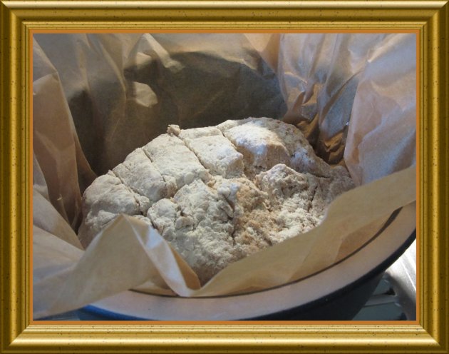 | Nach dem letzten Gehen den Brotteigrohling aus der Schüssel in den heissen Römertopf stürzen. Den Rohling leicht mit Mehl bestäuben.