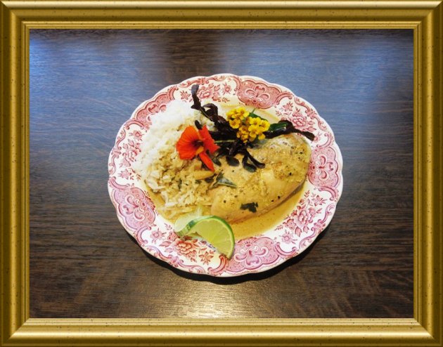 Dekoriert mit Limette, Eichblattsalat, Kapuzinerkresse und Lakritz-Pelagonienblüten