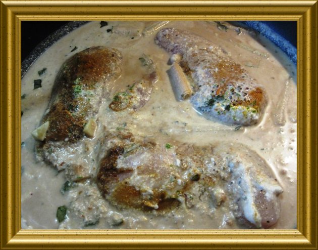 | 2 Knoblauchzehen | geschält, längs halbiert aufkochen. Diese Marinade heiss über die Hähnchenbrüste giessen. | |