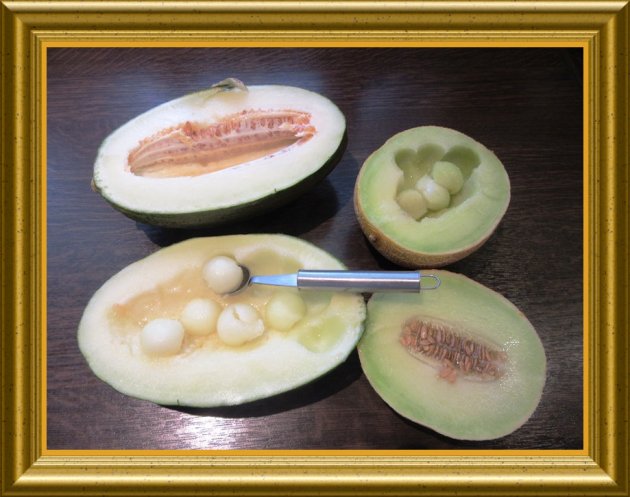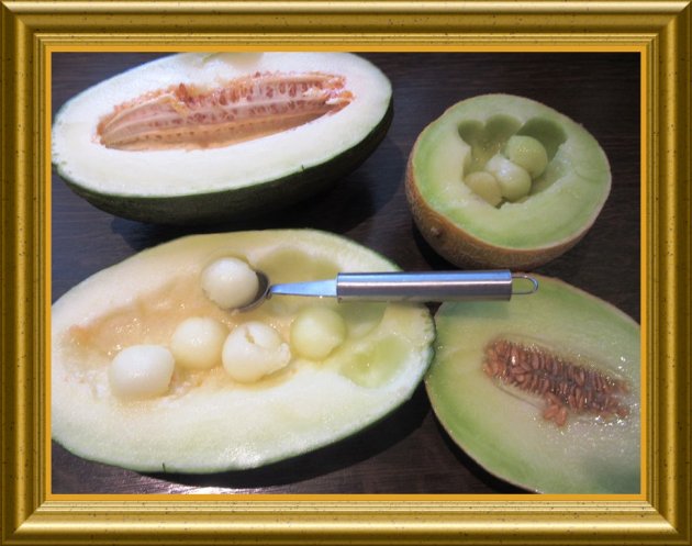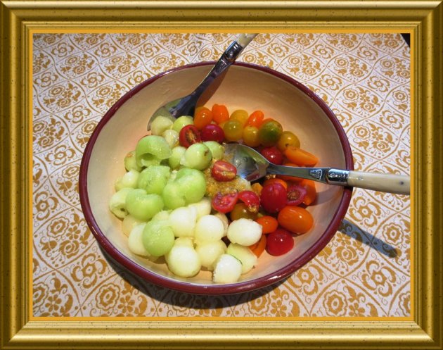 | 1 Galia Melone | kleine Melonenkugeln ausstechen und diese zusammen mit den Tomaten portionsweise anrichten. Je 2 EL Dressing darüber verteilen. | |