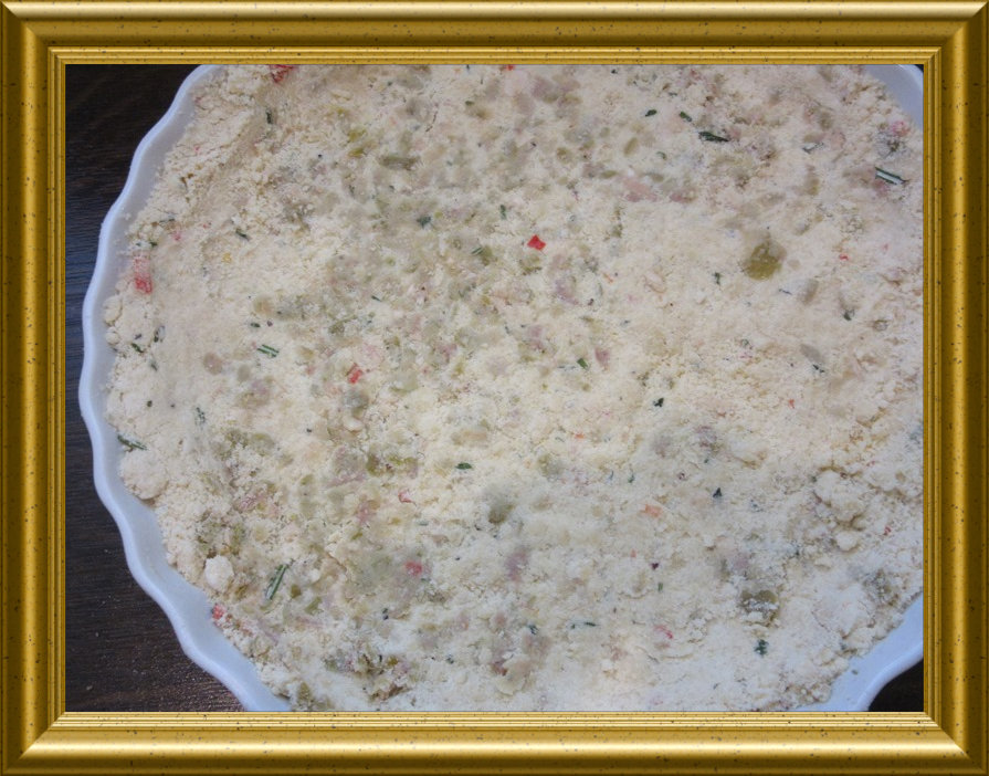 Hier ist der Streuselteig mit grünen gefüllten Oliven verfeinert.
