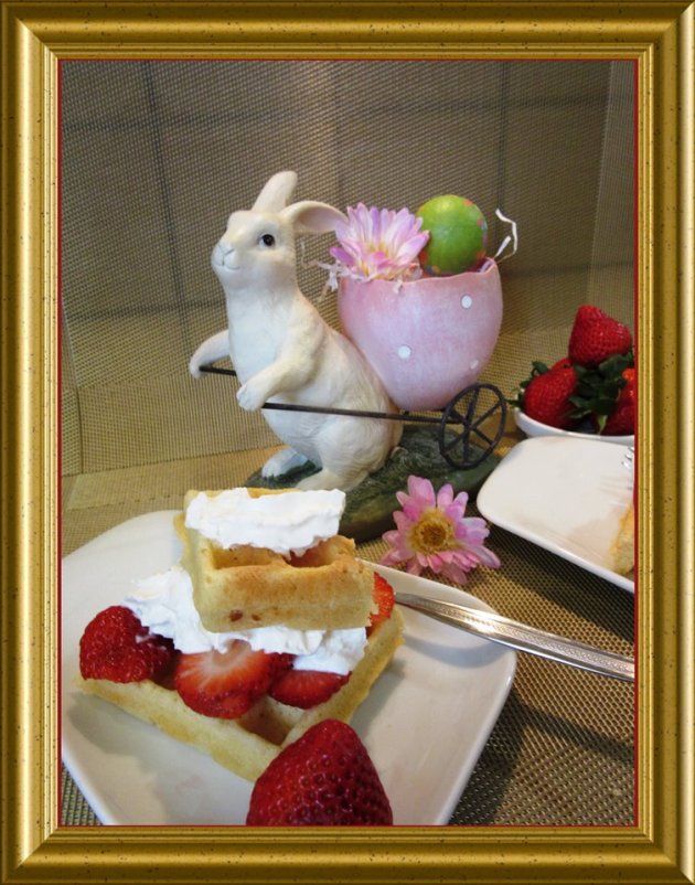 | Die Waffeln mit Sahne und Erdbeeren garnieren. | ||
