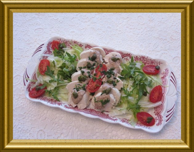 | Die Hälfte der Thunfischcréme auf der Servierplatte verteilen und die gut abgetupften Hähnchenbrustfilets in dünne Scheiben geschnitten darauf anrichten. Mit | ||