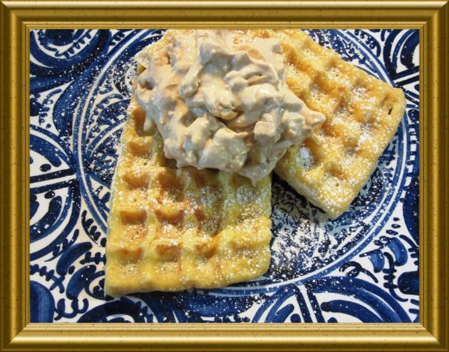 Die noch warmen Waffeln werden zum Vanille-Apfel-Quark serviert. |