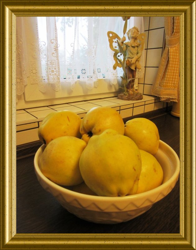 | 3 Quitten | schälen, vom Kerngehäuse befreien und in grobe Stücke schneiden. Zusammen mit | |