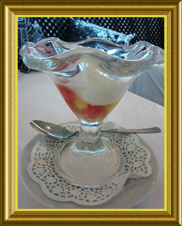 | Ich serviere das Sherbet mit einem selbstgemachten eisgekühltem Fruchtcocktail. | ||