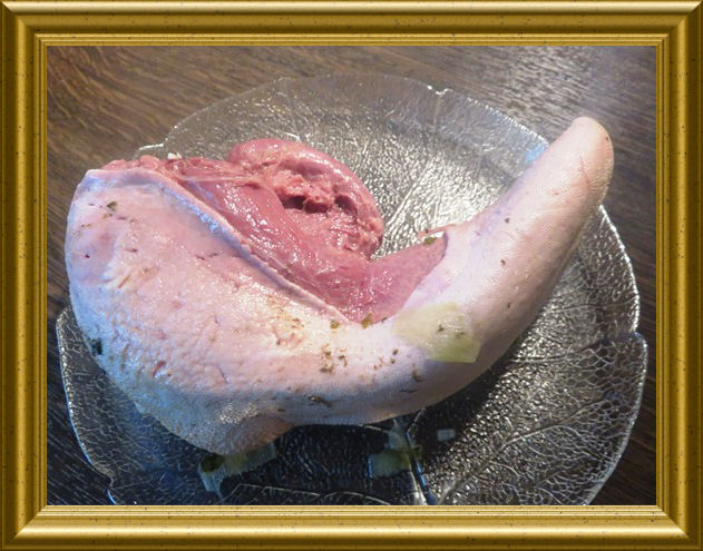 | Danach die Zunge herausnehmen , abtropfen lassen und von der gesamten Haut befreien. Knorpel und evt. Fett ebenso entfernen.