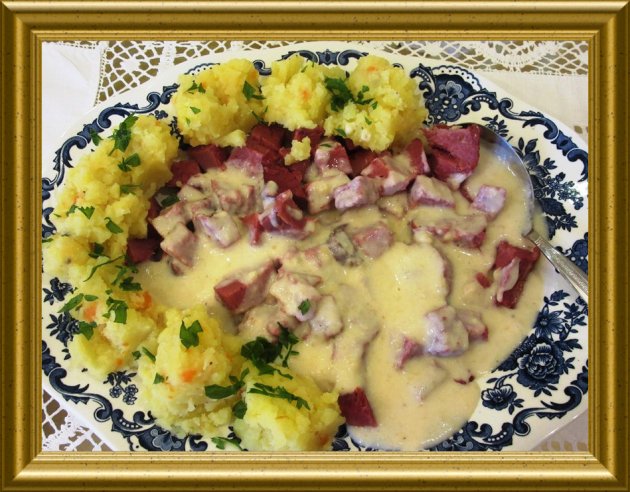 | Die Zungenwürfel halbieren und je eine Hälfte in die beiden Saucen geben. Kurz erwärmen.