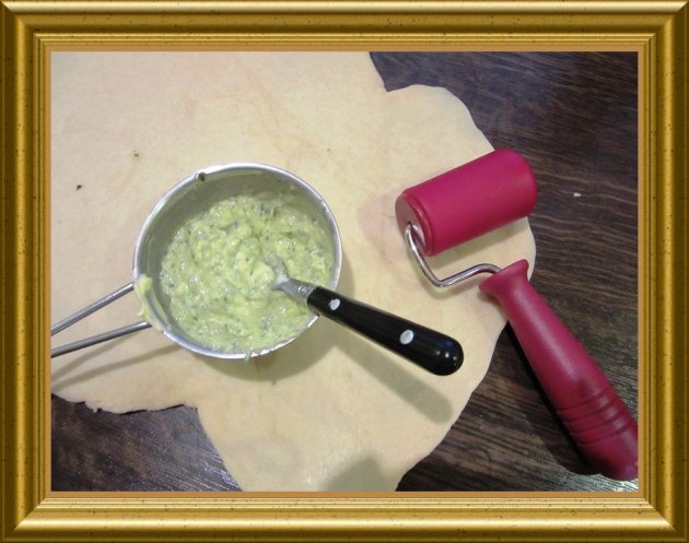| Den Hefeteig, nachdem er auf einer leicht bemehlten Arbeitsfläche gut durchgeknetet und zu 1 cm Dicke als Teigplatte ausgerollt worden ist, mit der Kräuterbutter bestreichen und mit | ||